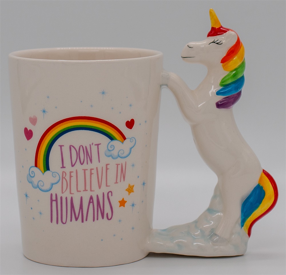 Drink your favorite beverage in this awesome Unicorn ceramic cup with the text “I don’t believe in humans”. Colorful and fun for everyone! The cup is microwave safe.